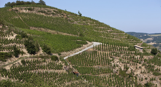 在北羅納河谷葡萄園,河流流經之處多為狹窄的峽谷和陡峭的山坡,因此葡萄園也更多地種植在靠近河流的陡坡上。由于離海洋較遠,北羅納河谷葡萄園以大陸性氣候為主,但又多多少少會受到地中海(Mediterranean)氣候的影響,夏季炎熱干燥,冬季寒冷少雨。這里的土壤以礫石、頁巖和石灰?guī)r為主,排水性能優(yōu)越。這樣一來,種植在山坡上的葡萄藤可以更好地接收生長季充足的陽光,再加上排水性良好的土壤,有助于葡萄果實更好地成熟。北羅納河谷葡萄園著名的子產區(qū)羅第丘(Cote Rotie)的產區(qū)名在法語中意為“被炙烤的山坡”,就很形象地描繪了這一風土特點。