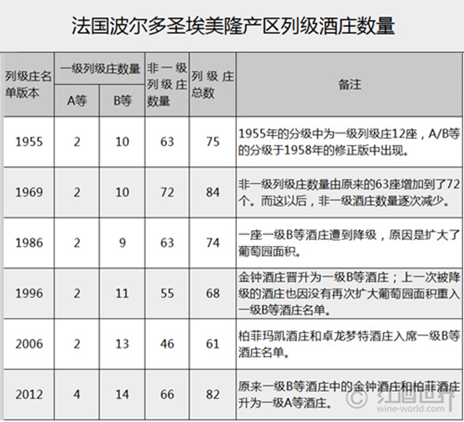 右岸的圣埃美隆葡萄酒商會(huì)在上世紀(jì)50年代決定起草一份列級(jí)酒莊分級(jí)制度,分為兩大等級(jí),一個(gè)是分為A、B兩等的一級(jí)列級(jí)酒莊(Premier Grand Cru Classe),另一個(gè)是列級(jí)酒莊(Grand Cru Classe)。與1855年波爾多分級(jí)體系不一樣的是,圣埃美隆酒莊的評(píng)級(jí)結(jié)果并不是一成不變的。