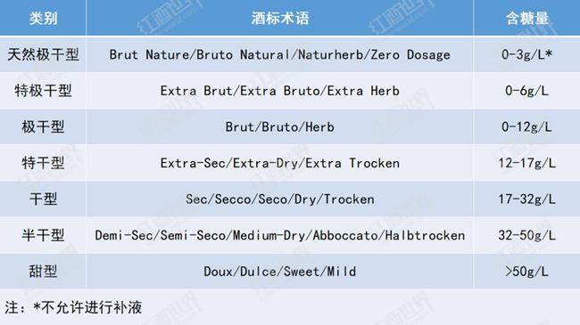 需要注意的是,天然極干型起泡酒是不允許使用含糖的調(diào)味液進(jìn)行補(bǔ)液的,表中0-3g/L的含糖量指的是二次發(fā)酵后酒中殘?zhí)堑暮糠秶?/span>