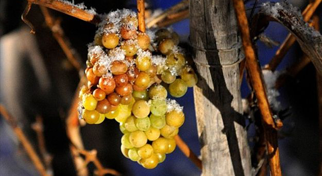 為了釀制冰酒,酒莊需要做足準(zhǔn)備。在秋季葡萄成熟的時(shí)候,要用保護(hù)網(wǎng)罩住葡萄藤,以保護(hù)葡萄果實(shí)不被鳥(niǎo)類(lèi)吞食。葡萄會(huì)一直留在葡萄藤上,直至室外溫度達(dá)到要求后才能采收。在這段時(shí)間里,葡萄脫水,汁液濃縮,賦予了冰酒特有的復(fù)雜性。