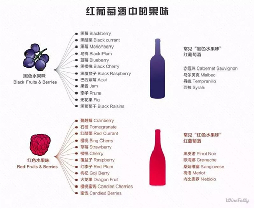 ①紅葡萄酒中的果味有兩類,紅色水果和黑色水果,這是盲品中判斷葡萄酒風格的一大依據;