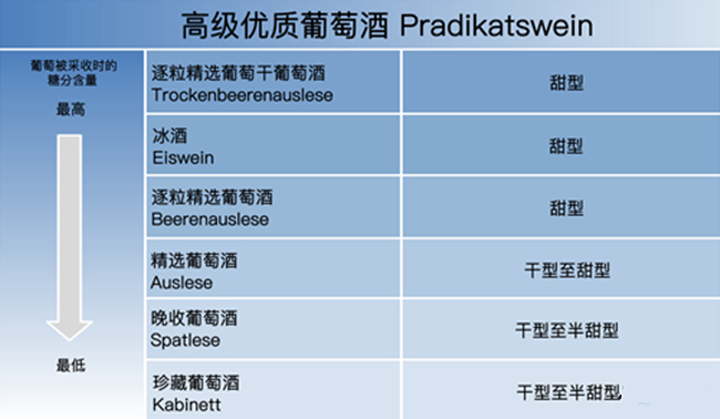 在德國,PDO葡萄酒的產(chǎn)量最大,而其中高級優(yōu)質(zhì)葡萄酒占有非常重要的地位。由于氣候寒冷,葡萄的成熟度對于德國葡萄酒來說至關(guān)重要,于是法律根據(jù)葡萄采收時的成熟度,又將高級優(yōu)質(zhì)葡萄酒細(xì)分為以下6個等級。別看它很復(fù)雜,但只要將這一分級看做葡萄酒的風(fēng)格劃分,理解起來就很容易了。