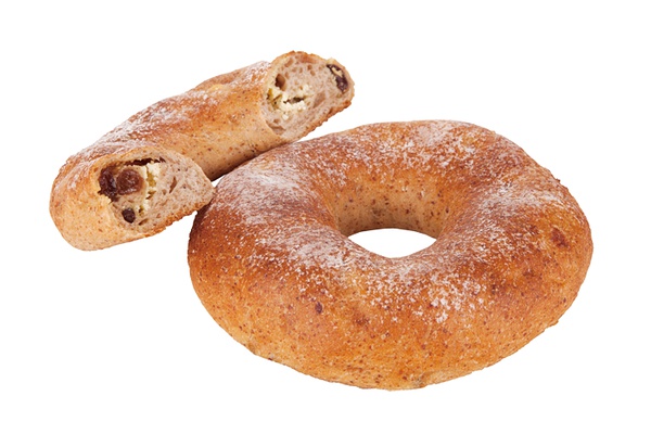 5.拍扁放軟質(zhì)奶油奶酪和提子干,下半折再上折捏合面團(tuán),搓長(zhǎng)。將一頭壓扁包入另一頭。(注意不要勉強(qiáng)搓長(zhǎng)回縮的話先松弛幾分鐘再搓)