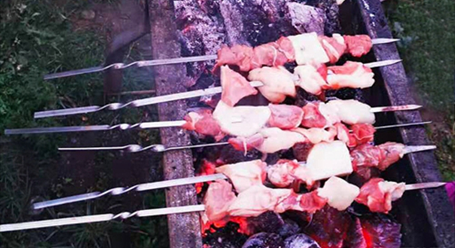 烤羊肉串是一種流行于中東、南亞、中亞、地中海、東亞等多個地區(qū)的羊肉菜式。在中國,烤羊肉串的歷史可追溯至東漢時期,20世紀(jì)80年代以來隨著時代的發(fā)展,在大江南北傳揚開來。烤羊肉串看似簡單,要保證羊肉既入味又鮮嫩卻并非易事,工序也十分考究——取新鮮羊肉或切片切塊,串穿在細鐵釬上,放置在烤爐上焙烤,再撒上些辣子面、胡椒粉和孜然粉等,不斷翻動,烤至雙面金黃,肉質(zhì)熟透。