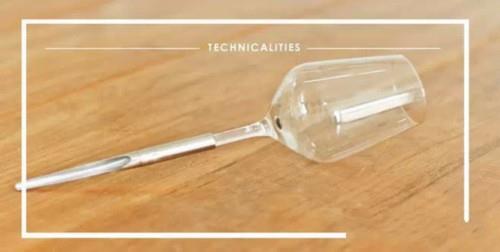 這款紅酒杯的上端設計和大家日常使用的紅酒杯相同,只不過在下端進行了創新設計。在酒杯的底部,并不是傳統底座式設計,而是采用了類似于針尖的形狀。