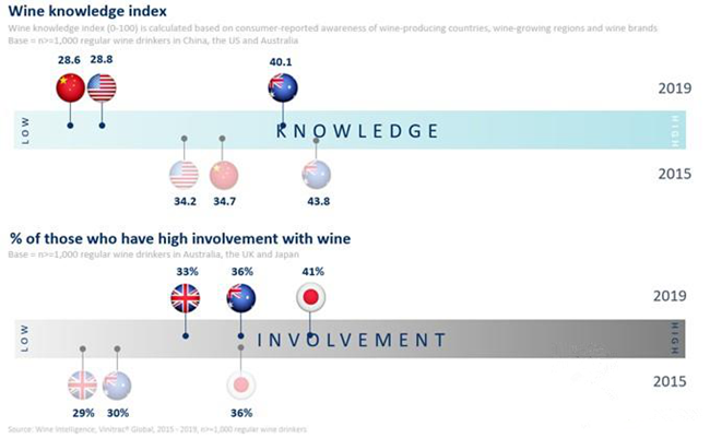 在主要市場中,澳大利亞和日本的葡萄酒市場在過去五年中增長最快。在日本,高參與度的葡萄酒消費(fèi)者的比例已經(jīng)從2015年的36%上升到2019年的41%,而澳大利亞高參與度的葡萄酒消費(fèi)者比例從30%上升到36%。