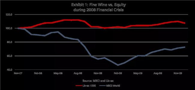 精品葡萄酒投資公司Cult Wines近日也發(fā)布了一份關于精品葡萄酒投資的統(tǒng)計分析報告,報告稱在2007年11月至2009年11月的整個金融危機期間,Liv-ex 1000指數(shù)的表現(xiàn)始終優(yōu)于摩根士丹利資本國際全球指數(shù)(Morgan Stanley Capital International Index,簡稱MSCI指數(shù),是一個市值加權股票市場指數(shù))。