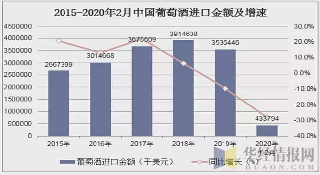 華經(jīng)產(chǎn)業(yè)研究院數(shù)據(jù)顯示:2020年1-2月中國葡萄酒進口數(shù)量為8260萬升,相比上年同期減少了3616.5萬升,降幅為30.4%;進口金額為433794千美元,相比上年同期減少了171071千美元,降幅為28.3%;2020年1-2月中國葡萄酒進口均價為5.252美元/升。