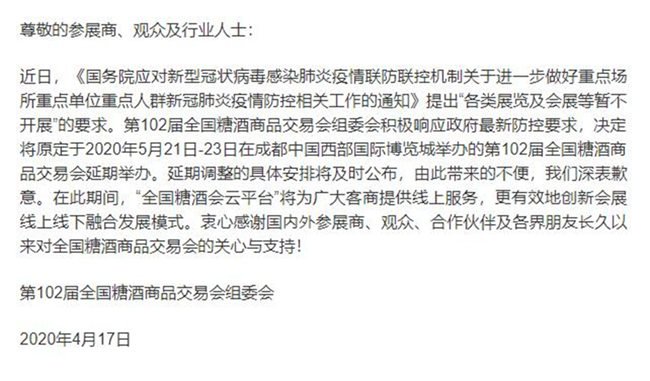 關于第102屆全國糖酒商品交易會延期舉辦的通知