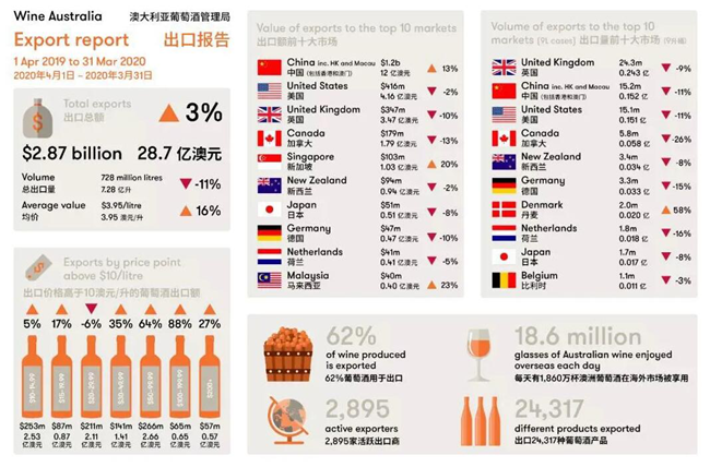 關于3月份的統計數字,澳大利亞葡萄酒管理局統計數字顯示,出口額相比上年同期降低了43%。今年1~3月份澳洲酒對華出口額也降低了14%,下降幅度明顯,而這主要是因為疫情所導致。即使這樣,如果算上2019年的后三個季度,澳洲酒在中國仍然強勢增長,可見2019年奠定的優勢有多大!