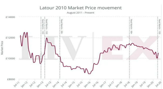 本周,拉圖Latour 2010年交易總值領先。此酒經多次的評分升級和降級后,最近Neal Martin給它100滿分;并形容它為“國王”。Martin說:“如我的酒窖只可容一瓶2010年份,那便是拉圖”。