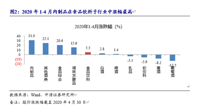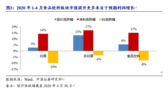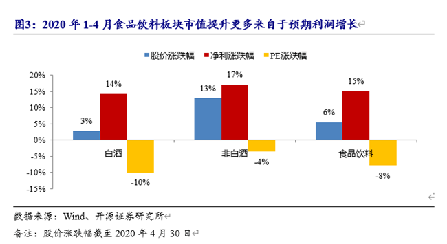 2020年1-4月食品飲料板塊上漲5.5%,在一級子行業(yè)中排名第三。漲幅分解來看,預(yù)計(jì)2020年凈利增長15%。