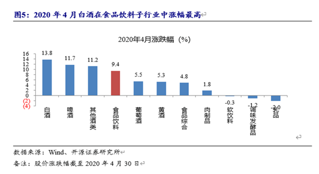 尤其是進(jìn)入2020年4月份以來,食品飲料板塊上漲9.4%,其中重要原因是:國內(nèi)疫情控制得當(dāng),消費(fèi)回暖,以白酒為代表的可選消費(fèi)重新獲得市場青睞,漲幅領(lǐng)跑各大品類,為13.8%,而葡萄酒銷售亦有上漲趨勢,為5.5%。