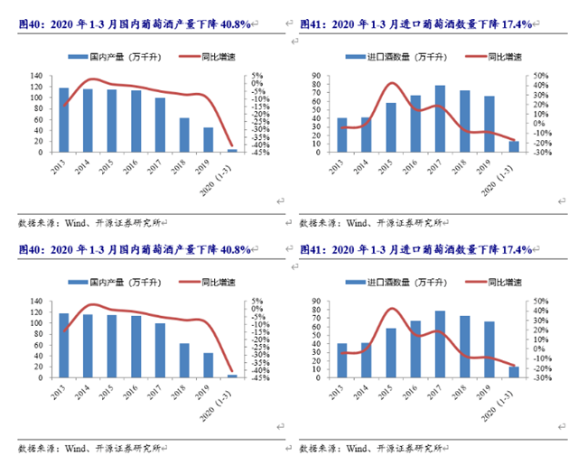 觀察行業(yè)數(shù)據(jù),2020年1-3月國內(nèi)葡萄酒產(chǎn)量同比降40.8%,降幅較年初擴(kuò)大;進(jìn)口酒量同比下滑17.4%,同樣加速下滑。