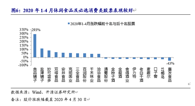疫情期間消費(fèi)場景發(fā)生變化,封城、封路、居家隔離使得消費(fèi)者更多集中在家庭消費(fèi),具有居家囤貨需求的必選消費(fèi)以及具備“宅文化”屬性的休閑食品表現(xiàn)較好。其中,葡萄酒品類中的通葡股份有著較突出表現(xiàn)。