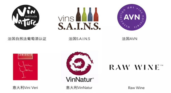 除左上角法國自然法葡萄酒認(rèn)證標(biāo)識為官方認(rèn)證外,其余均為自然酒聯(lián)盟組織