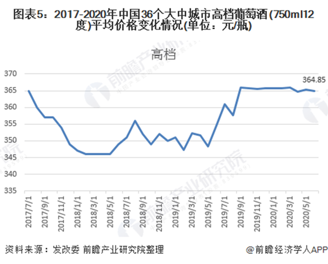 根據發改委披露的2017-2020年中國36個大中城市日用工業消費品平均價格來看,2017-2020年我國葡萄酒價格整體上呈現先下降后增長的態勢。其中高檔葡萄酒價格波動幅度略高于中低檔葡萄酒。截至2020年6月,我國高檔葡萄酒平均價格為364.85元/瓶,中低檔葡萄酒平均價格為89.75元/瓶。