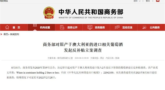 8月31日,商務部發布2020年第35號公告,決定即日起對原產于澳大利亞的進口裝入2升及以下容器的葡萄酒進行反補貼調查。該產品英文名稱:Wines in containers holding 2 liters or less,歸在《中華人民共和國進出口稅則》:22042100。本次調查通常應在2021年8月31日前結束調查,特殊情況下可延長至2022年2月28日。