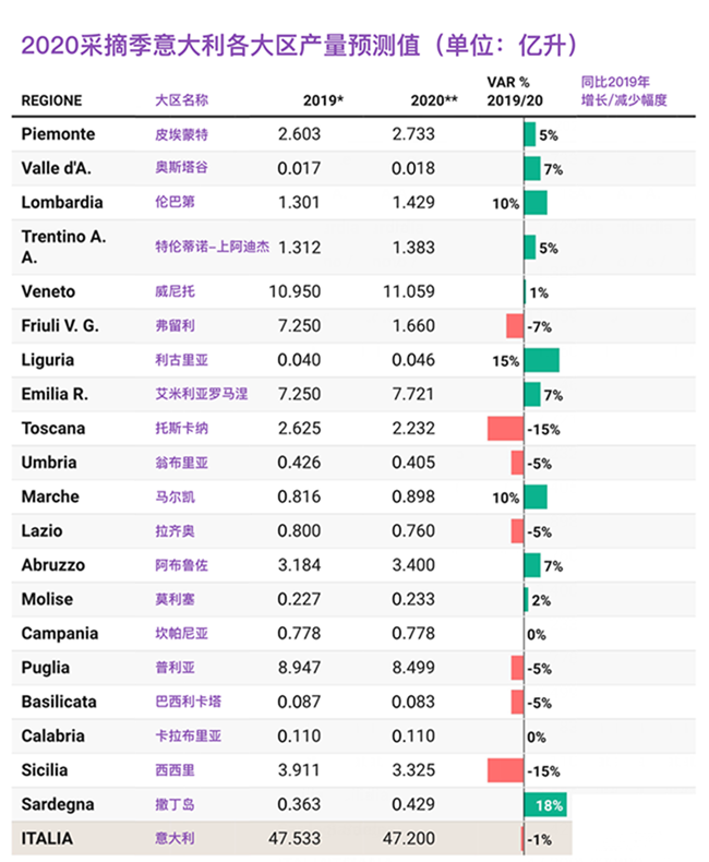 從意大利國(guó)內(nèi)各大區(qū)的葡萄酒產(chǎn)量來(lái)看,今年意大利北部的葡萄酒產(chǎn)量同比2019年略增加了3%,中部和南部則分別減少了2%和7%。