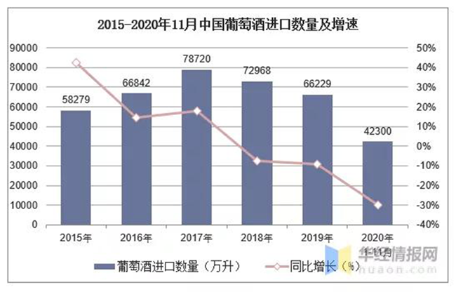 2015-2020年11月中國葡萄酒進口數量及增速