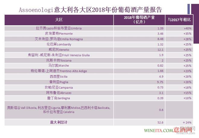 11月中旬,隨著意大利全境葡萄采摘季結束,意大利釀酒師及釀酒技術協會(Assoenologi)公布了關于2018年份意大利葡萄酒的產量報告。基于意大利農業部的官方數據,該報告做出結論:2018年,意大利葡萄酒及葡萄汁產量將比2017年份增長24%,將達到52.6億升。今年意大利葡萄酒產量的實際增幅超越了8月末曾發布的產量預告,整體形勢較為樂觀。