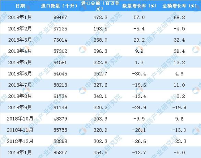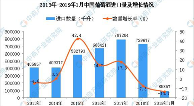 據中商產業研究院數據庫顯示,2013年-2017年中國葡萄酒進口量增長,共增長381347千升,增長93.96%;2018年中國葡萄酒進口量回落,2019年1月中國葡萄酒進口量為85857千升,同比下降13.7%。