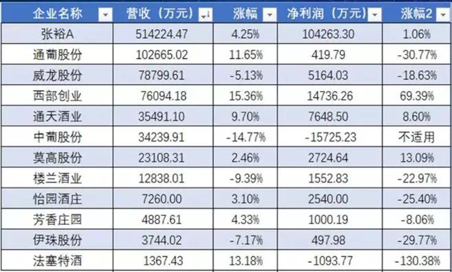 2018年被認為是中國葡萄酒行業(yè)的調(diào)整之年,整個葡萄酒行業(yè)呈現(xiàn)出小幅下滑的局面,據(jù)國家統(tǒng)計局數(shù)據(jù),2018年全國規(guī)模以上葡萄酒企業(yè)總產(chǎn)量62.9萬千升,比2017年下降7.36%;累計實現(xiàn)銷售收入288.51億元,同比下降9.51%;累計實現(xiàn)利潤總額30.63億元,同比下降9.46%。這12家上市企業(yè)發(fā)布的年報數(shù)據(jù),與去年整年的行業(yè)氛圍相符。大概也正是因為去年行業(yè)“看跌”的聲音不絕于耳,提前打了“預(yù)防針”,當全年數(shù)據(jù)公布和12家公司年報披露時,行業(yè)沒有表現(xiàn)出很大的落差。