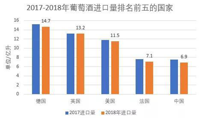 2018年葡萄酒進(jìn)口排名前五的國家分別是德國(14.7億升)、英國(13.2億升)、美國(11.5億升)、法國(7.1億升)和中國(6.9億升),占2018年全球葡萄酒進(jìn)口量的一半以上。