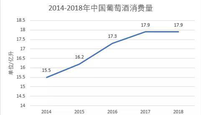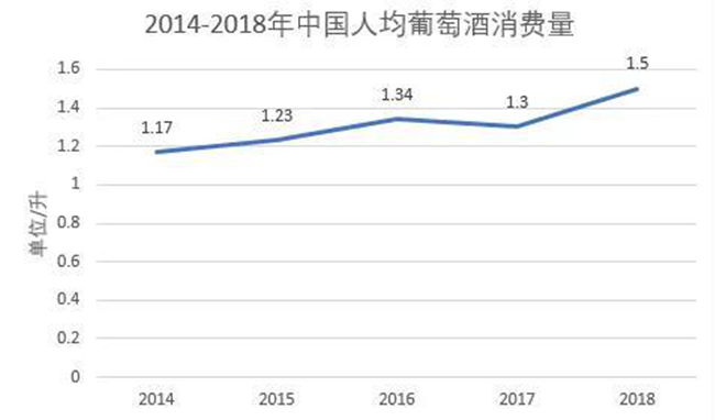 如上圖數(shù)據(jù)顯示,從2014-2018年,中國的葡萄酒人均消費量從1.17升上漲至1.5升,增長了28.2%,顯示出中國市場葡萄酒消費的強(qiáng)勁增長態(tài)勢。