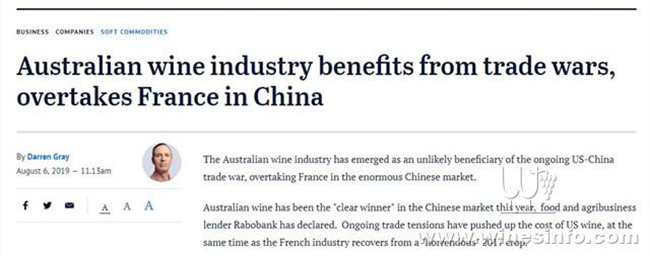 2018年澳洲對中國葡萄酒出口量上漲19.8%,且在2019年的前4個(gè)月中更是上漲了25.7%。(網(wǎng)頁截圖/《時(shí)代報(bào)》)