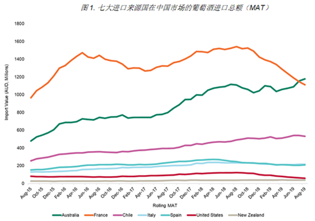 圖1.七大進(jìn)口來源國在中國市場的葡萄酒進(jìn)口總額 (MAT)