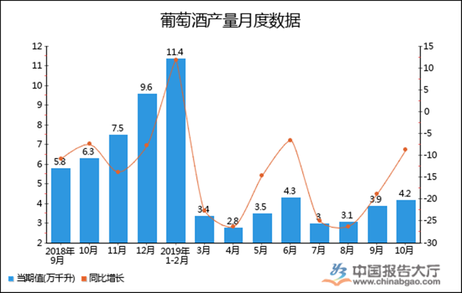 2019年1-02月全國葡萄酒產量累計值為11.4萬千升,累計增長11.8%。