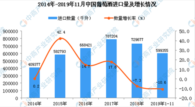 據(jù)中商產(chǎn)業(yè)研究院數(shù)據(jù)庫顯示,2014-2017年中國葡萄酒進口量逐漸增長,2018年中國葡萄酒進口量有所下降;2019年1-11月中國葡萄酒進口量為599355千升,同比下降10.6%。