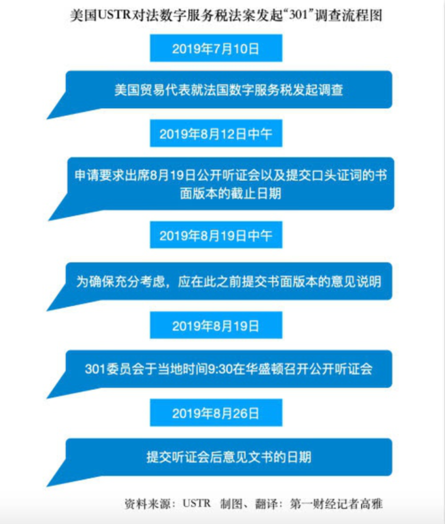 USTR在對(duì)法“301調(diào)查”后,認(rèn)定法國(guó)數(shù)字服務(wù)稅歧視美國(guó)企業(yè),擬向63項(xiàng)總價(jià)值為24億美元的法國(guó)輸美產(chǎn)品加征最高100%的關(guān)稅,USTR此前還特地在聲明中指出,在聽證會(huì)后,希望“迅速進(jìn)行征稅等活動(dòng)”。