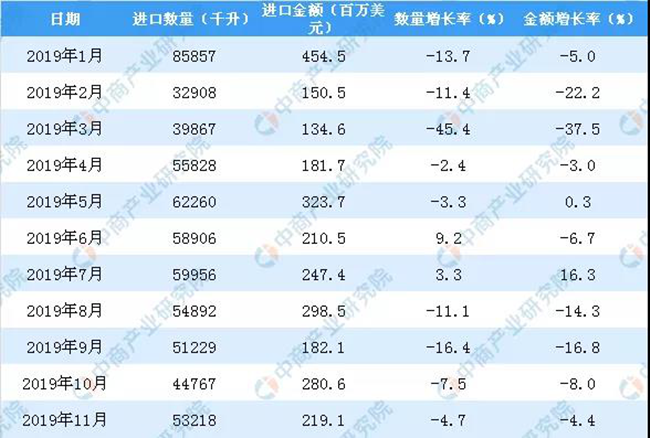 2019年1-11月中國葡萄酒進口量同比下降10.6%