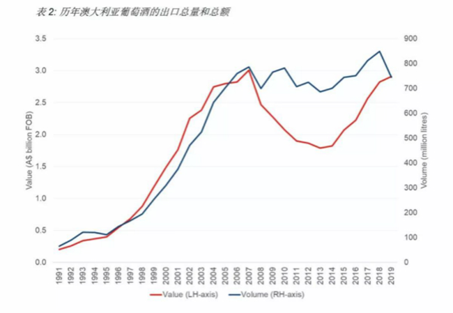 截至2019年12月底的12個月中,澳大利亞葡萄酒對中國市場(包括香港和澳門)的出口額增長12%,創下12.8億澳元新高,出口量下滑17%至1.42億升 (等量于1580萬箱9升裝)。平均出口額增長35%至8.99澳元(每升離岸價)。澳大利亞葡萄酒對中國市場的出口總額及平均出口額雙雙創下了年度新高。