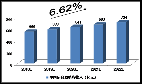 2016年,全國規(guī)模以上葡萄酒企業(yè)共240家,累計實現(xiàn)銷售收入484.54億元,同比增長3.97%。我們預(yù)計,2018年我國葡萄酒銷售收入將達(dá)到560億元,未來五年(2018-2022)年均復(fù)合增長率約為6.62%,2022年將達(dá)到724億元。