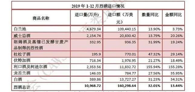 2月25日,中國食品土畜進出口商會酒類進出口商分會發(fā)布《2019年全年酒類進口數(shù)據(jù)》。數(shù)據(jù)顯示,019年1-12月,烈酒進口量1.1億升,同比增長32%;進口額16.億美元,同比增長13.4%。烈酒在過去的一年里,一路逆市飄紅,統(tǒng)計在內(nèi)的各烈酒酒種全部實現(xiàn)量額齊增。