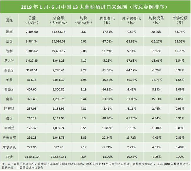 中國酒類進(jìn)出口商會(China Chamber of Alcohol Importers and Exporters)公布了 2019 年 1 月- 6 月中國的 13 大葡萄酒進(jìn)口來源國及相關(guān)數(shù)據(jù):